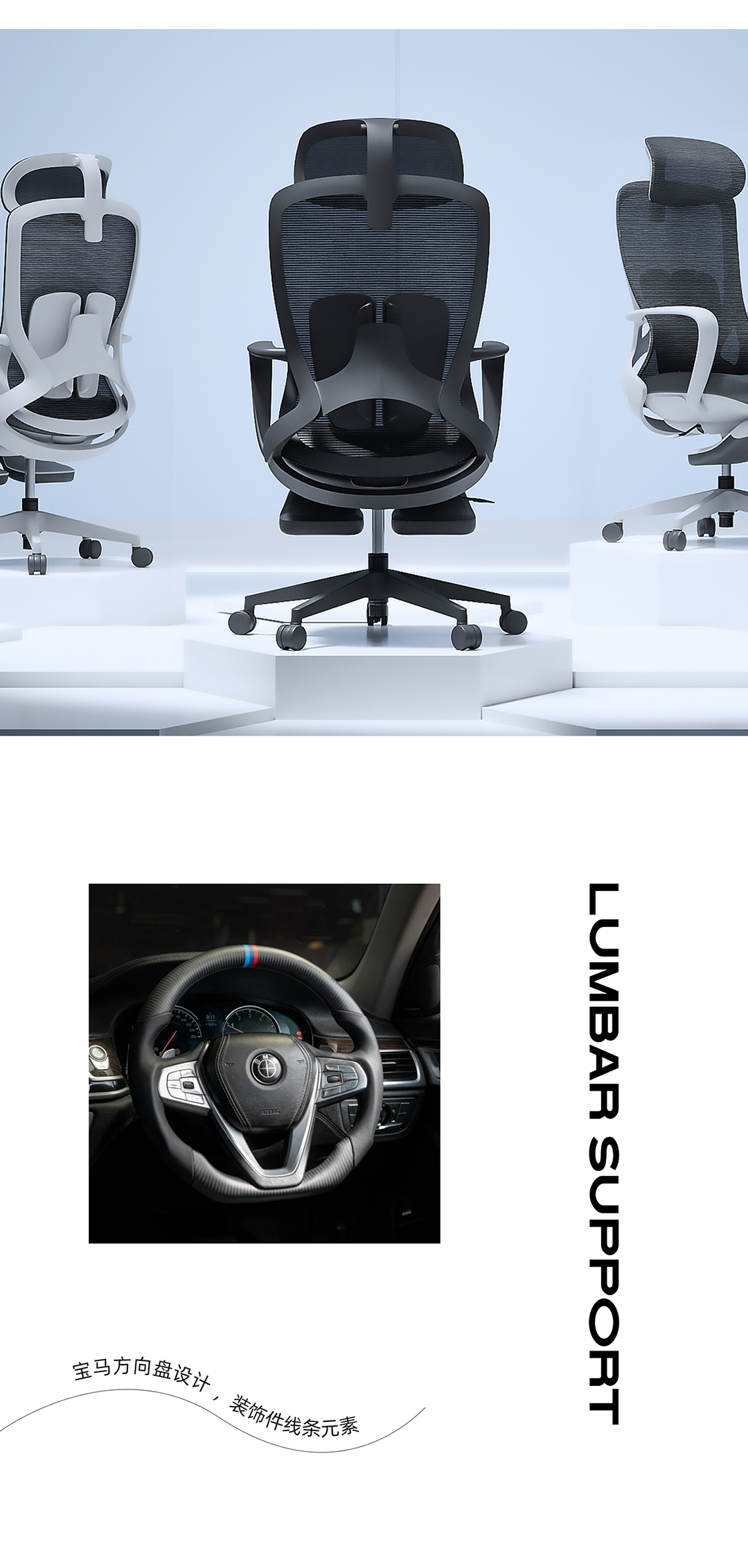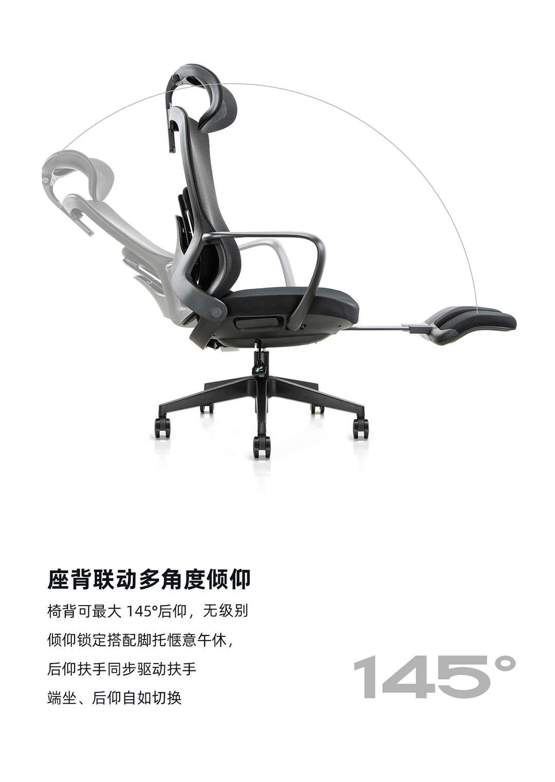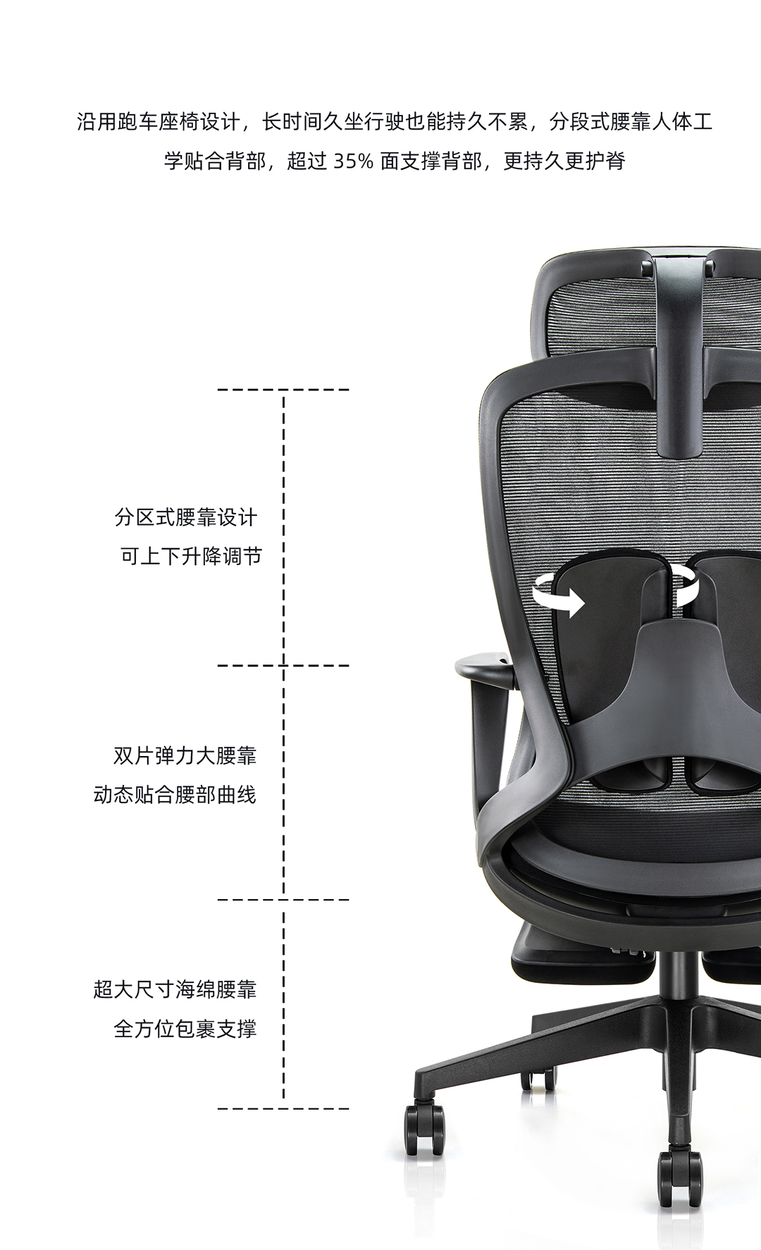 * 黑色PP+玻纤背框,海绵包双腰靠设计,可升降